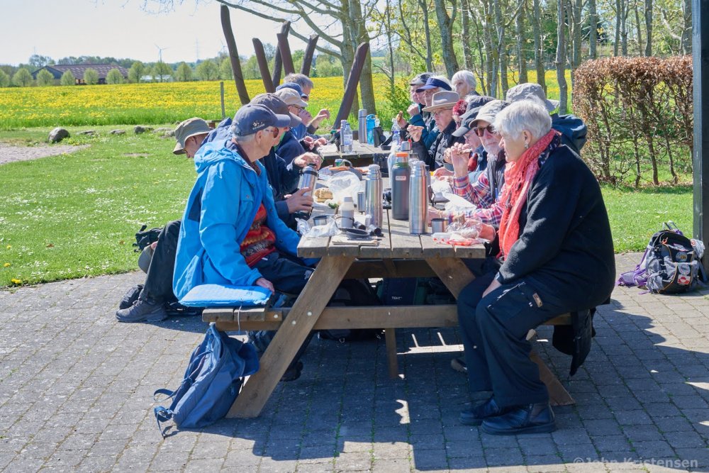 Frokosttid var ved at nærme sig og den blev ved 12-tiden indtaget ved Vikinge Centret i sol og varme. Efterfølgende gik vi ned til fugleskjulet ved Tissø. En del tog herefter hjemad, mens Jon lokkede resten med en tur ad trampesti ned til haleby Ås udløb i Tissø (en tur på i alt ca. 2,5 km.).
