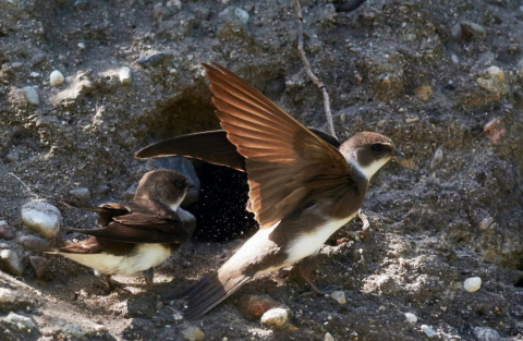 Digesvalepar i færd med at grave redehul i grusbunken i reservatet. Foto Ole Gabrielsen.